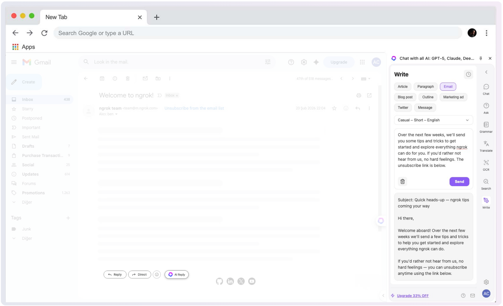 Manage all your text workflows—from email correspondence to corporate reports, social media content to technical documentation—without switching browser tabs. The AI panel that steps in during writing, editing or content development works seamlessly with platforms like Gmail, LinkedIn and Twitter to deliver a professional writing experience.